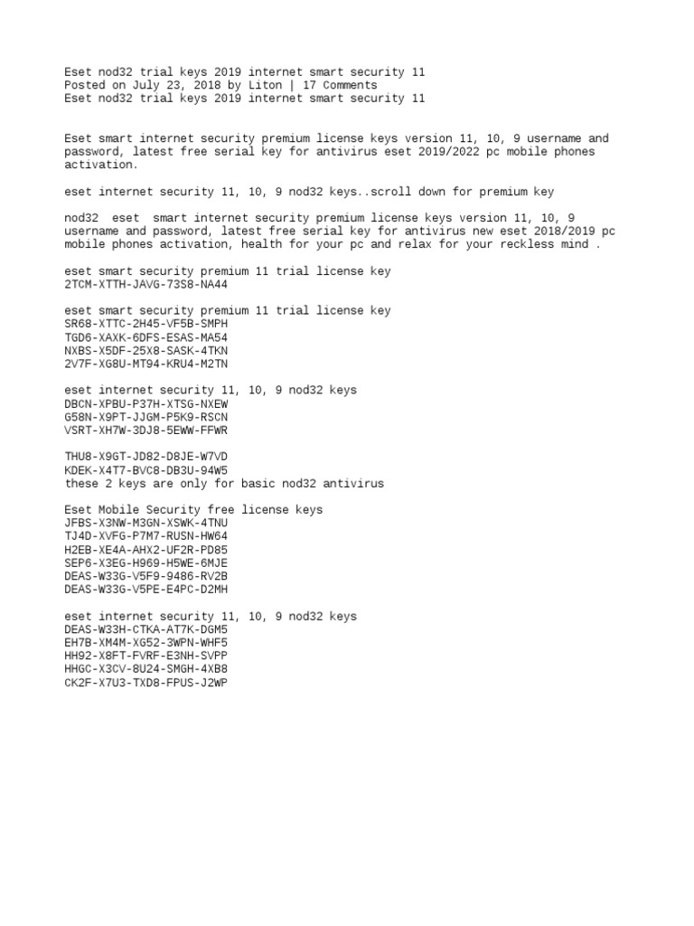 Keys For ESET NOD32 | Ключи для НОД32 - Telegram Platform. Join. Keys For ESET NOD32 | Ключи для НОД32. 36.8K subscribers. Internet security & mobile security ... Key : 389W-X2KD-BWDH-WC7W-T4WH Key : XC3C-XN5D-V2VU-XHH5-H5KW Key : UCG9-XWF6-VJKE-55GX-982G. leksago.pl Eset Logins. Eset NOD32 serial key Eset Smart Security güncel lisans anahtarları eset mobile security serial key aramalarından birini yaptıysanız doğru sayfaya geldinizOriginal ESET License [ Internet Security ] Expire Date : 1st. 615k. 1 Pro x64, Windows 7 Ultimate x64 SP1, Nov 16, 2020 · Vote for forum moderators !!! Type your search ... frogclash.de Eset internet security 13 license key Free ESS Smart Security mobile keys, EAV 9,10,11 License Activate keys DEAS-W33H-CA78-88GH-8TSG NFTD-X456-C3EP-GJF3 ESET Smart Security ()ESET Smart Security Premium ()ESET NOD32 Antivirus (Windows, Linux)ESET Cybersecurity ()ESET Mobile Security (Android, Windows Mobile, Symbian) Apr 08, 2021 · Akcja z ESET …