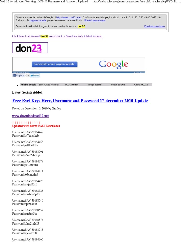 Eset Nod32 Username Password Activation Update 2016 Eset Nod32 ESS Username Password Serial License Update 2015 NOD32 CLAVES SERIAL UPDATES A site providing Eset Nod32 Username Password Updates and Nod32 Id daily valid for EAV/ESS version. Eset Nod32 Activation Username & Password Lifetime - Home Eset Nod32 Activation Username & Password Lifetime. 775 likes · 5 talking about this. ESET's award-winning NOD32® Antivirus technology is at the cutting... anod32: Eset Nod32 username and password 16/02/2012 · First use eset smart security download trial link to download eset free trial antivirus.(if it asked for nod32 username passwords get a eset nod antivirus password from this page) Or else you may download this from official web site or from eset torrent. (Note: There will be several eset products, do not download eset sysrescue, since it’s not a virus guard). … Eset .rar Windows Ultimate Registration Full Version ... Crystal Smith on Eset .rar Windows Ultimate Registration Full Version Serial X32. eset antivirus username password, eset nod32 antivirus username and password, eset nod32 antivirus username and password 2021, eset nod32 antivirus 4 username and password, eset nod32 antivirus username and password 2020 free, eset nod32 antivirus 8 username and password 2021, eset nod32 antivirus 4 username and ...