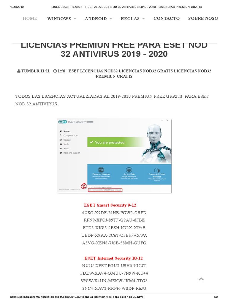 Licencias Eset NOD32 y Smart Security [MARZO 2022] ️ Claves de LICENCIAS o SERIALES para los productos de ESET NOD32 Antivirus y Smart Security para PC y Android GRATIS. Licencias Eset 8/9/10/11/12/13/14/15 .