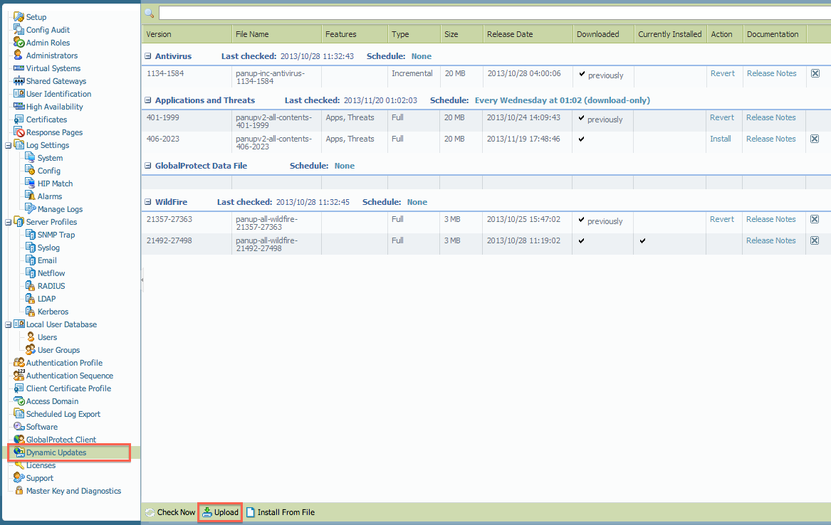 How to Manually Install Antivirus, Content, and ... - Palo Alto Networks This document describes the steps to manually install the antivirus, content, and WildFire updates on the Palo Alto Networks firewall. Log into the Palo Alto Networks Customer Support Portal Download the update files by navigating to Updates > Dynamic Updates Steps From the WebGUI, go to Device > Dynamic Updates