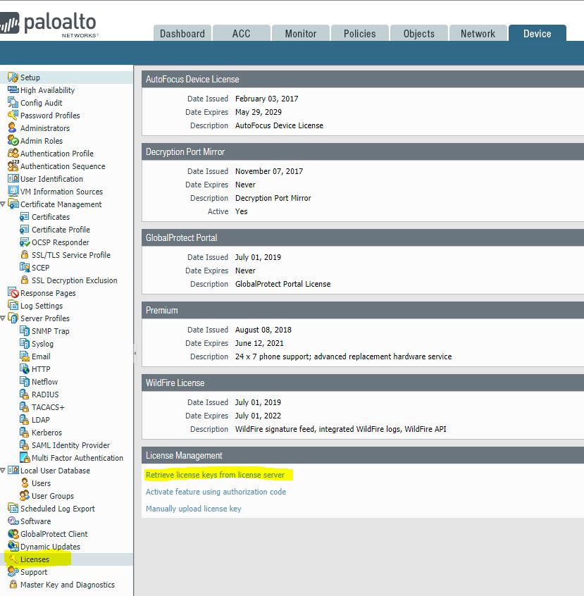 Activating Licenses and Subscriptions in Palo Alto Firewalls If your devices are in offline mode, then you can choose this option for activating licenses in PaloAlto firewalls. In this option, you need to download licenses file from PA support portal (support.paloaltonetworks.com). Lastly, we need to upload licenses file in Palo Alto firewall by clicking Manually upload license key option.