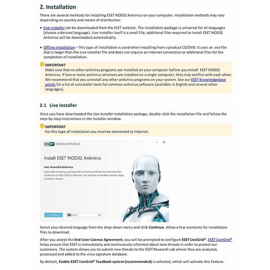 Antivirus for Windows and macOS devices | ESET - ESET NOD32 Download the ESET NOD32 Antivirus installer file here. 3. Double-click the installer file to begin the installation and follow the on-screen instructions. 4. Activate your protection by logging in to, or creating, your ESET HOME Account, or by inserting your unique license key. More details about product installation and activation can be found here. How do I renew my license? Once your ... Download Antivirus for PC – ESET NOD32 Antivirus Software Download ESET NOD32 Antivirus. Download the newest version that can be activated with a purchased license or as a free 30-day trial Download Now. Downloads Live Installer that will guide you through the installation and activation. Configure download . Download . Filename: | File size: | Version: Changelog . Documentation. Download Options. Back to simple download . Advanced … NOD32 Antivirus Award-Winning Protection for Windows PC | ESET We have designed and built ESET NOD32 to be the best antivirus app for all types of computers. Whether you have a blazingly fast gaming laptop or an economical desktop PC with a limited amount of RAM and an older CPU, you will find that our award-winning antivirus suite runs quietly in the background. Unless you run a deep scan at the same time as playing a game that is …