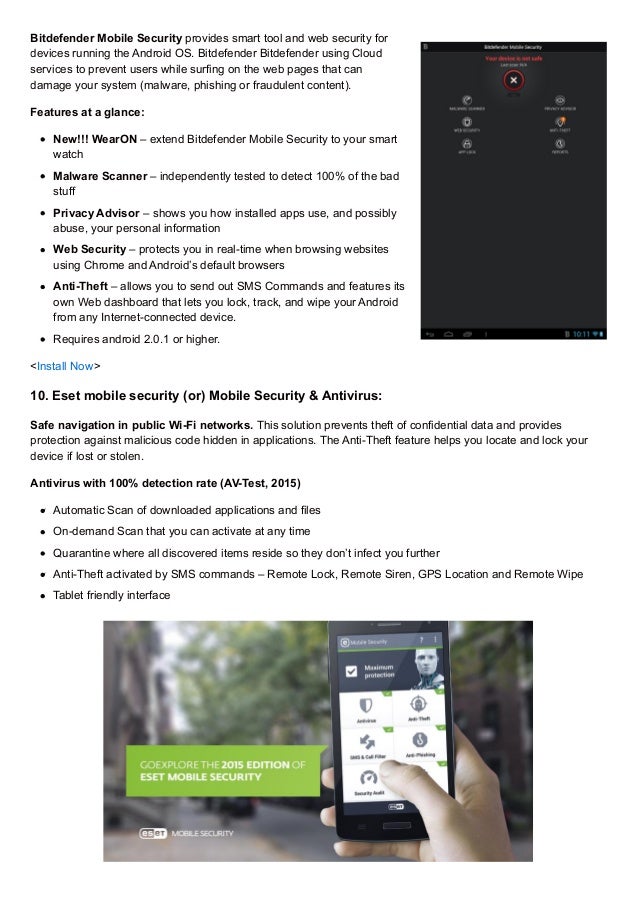 Bitdefender Mobile Security for Android Devices WebBest protection for your Android smartphone and tablet; Protects you from falling victim to link-based mobile scams IMPROVED Secure VPN for a fast, anonymous and safe experience while surfing the web – 200 MB/ day IMPROVED Remotely locate, lock and wipe your Android device in case of loss or theft