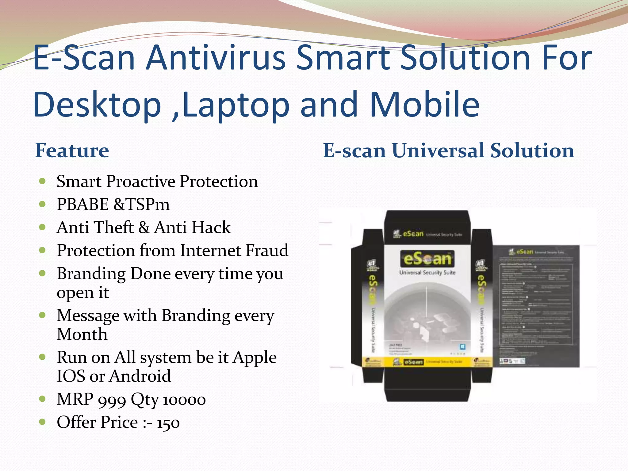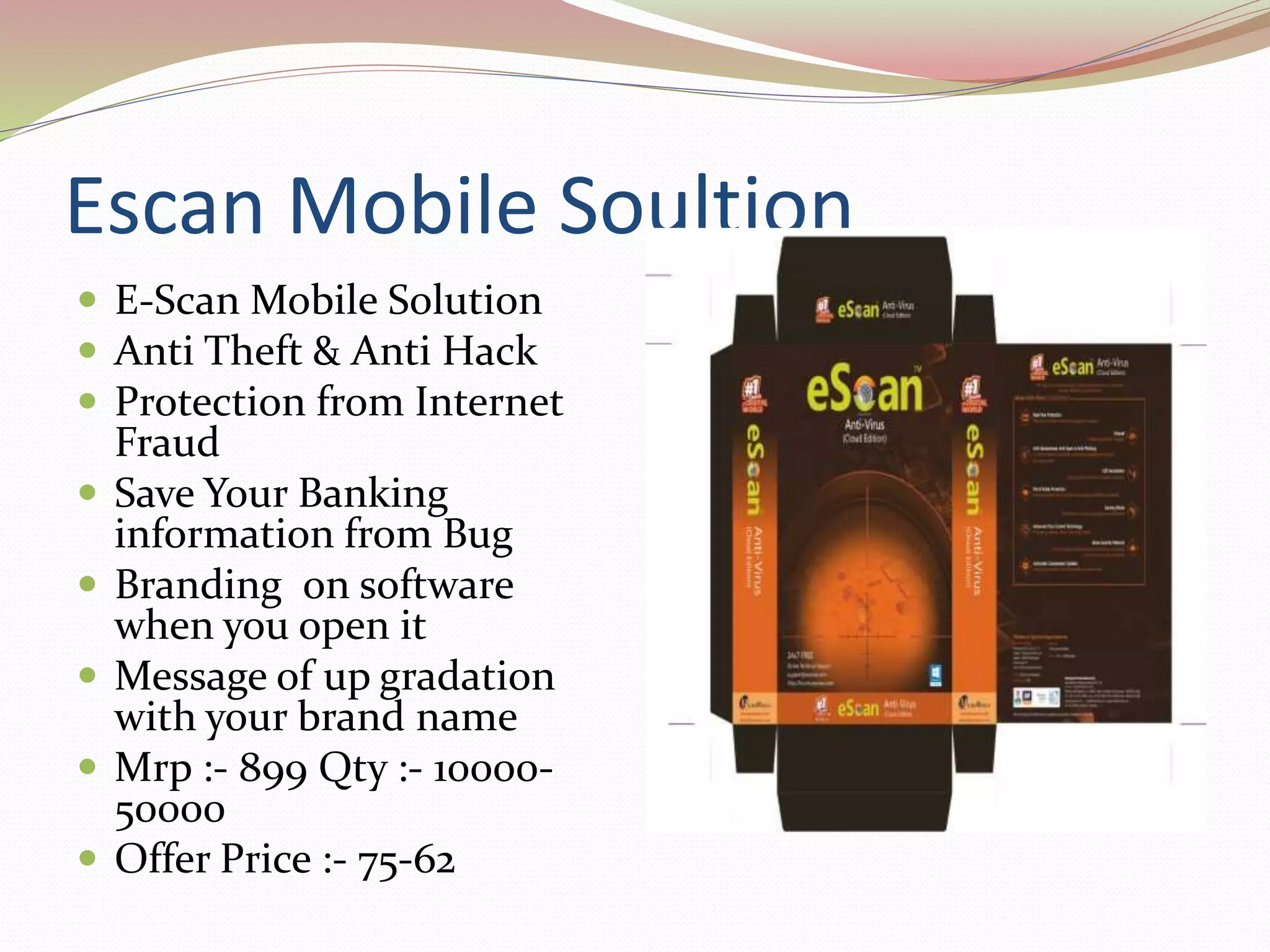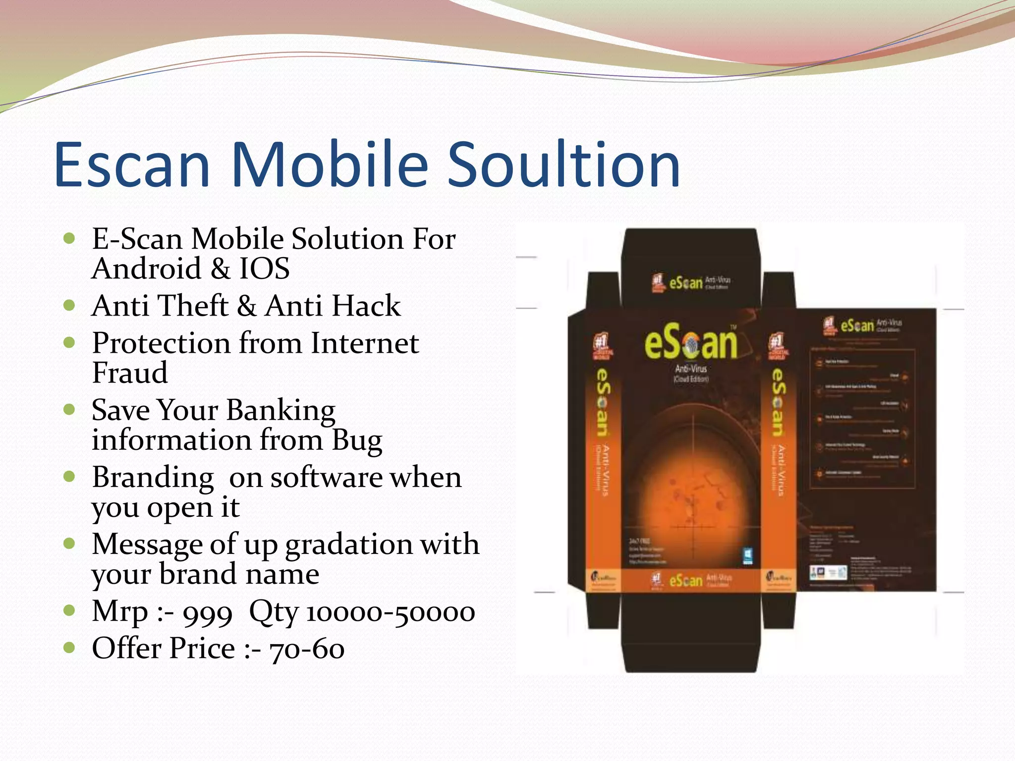 eScan vs Trend Micro| Which One Is The Quickest Path To Love eScan. eScan antivirus software is an advanced, pro-active Anti-Virus and Content Security solution to ensure that your systems are safe from viruses, spyware, adware, keyloggers, hackers, phishing, data theft, objectionable content, and much more. eScan antivirus app is an internet security solution that provides virus protection to businesses ...