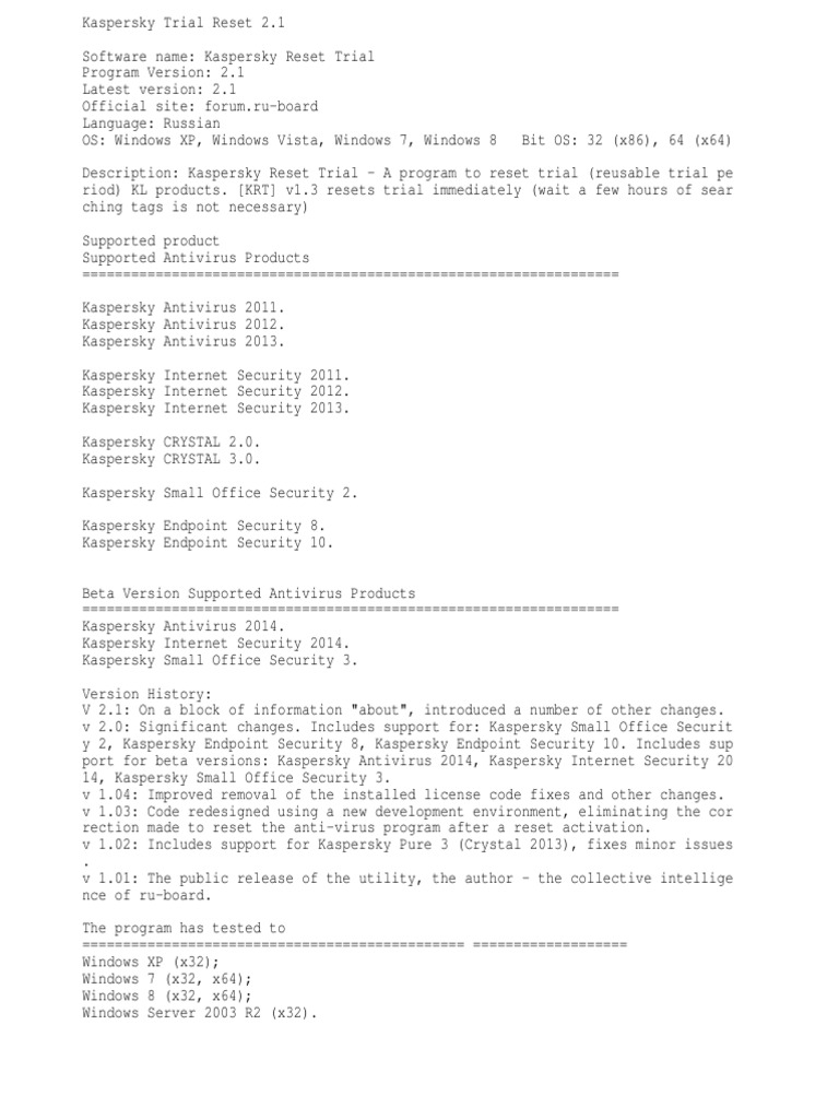 Free Antivirus Software 2023 for all Devices | Kaspersky Gives you free antivirus and more. As a free antivirus scanner and cleaner, Kaspersky Free software defends your PC and Android devices against viruses, infected files, dangerous applications and suspicious sites. Secures…. Without slowing you down. Our security is designed to protect your devices - without getting in your way. Kaspersky Anti-Virus - Wikipedia Kaspersky Anti-Virus (Russian: Антивирус Касперского (Antivirus Kasperskogo); formerly known as AntiViral Toolkit Pro; often referred to as KAV) is a proprietary antivirus program developed by Kaspersky Lab.It is designed to protect users from malware and is primarily designed for computers running Microsoft Windows and macOS, although a version for Linux is available for ... Removal tool for Kaspersky applications (kavremover) Kaspersky Security Scan (all versions) Kaspersky Endpoint Security for file servers and workstations for Windows (version 8 and later) Kaspersky Anti-Virus 6.0/6.0 R2 for Windows Workstations